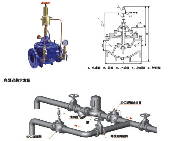 導(dǎo)閥可以通過下游壓力的變化而開大或關(guān)小其自身的小閥口,從而改變隔膜(活塞)上方控制室的壓力值,控制主閥閥瓣的調(diào)節(jié)位置??捎糜谏罱o水、消防系統(tǒng)及工業(yè)給水系統(tǒng)。